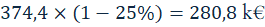 En retenant un taux d’impôt sur les sociétés de 25 %, le flux annuel net après impôt s’établit à :